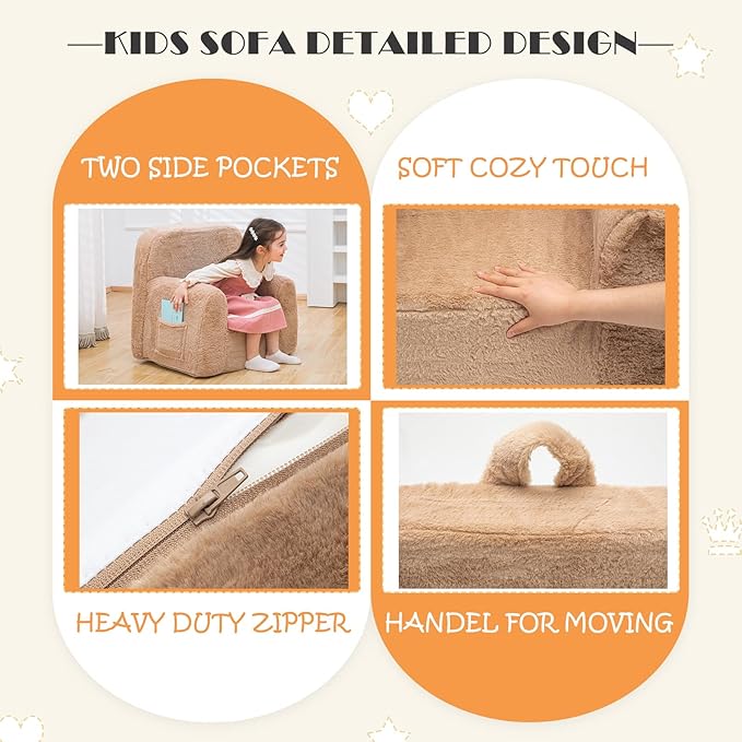 Snuggly-Soft Cuddly Toddler Plush Armchair for Boys and Girls Fuzzy Plush Kids Sofa Couch Reading Chair with Children Friendly Handle for Easy Movement & Double Pockets for Good Storage, Camel
