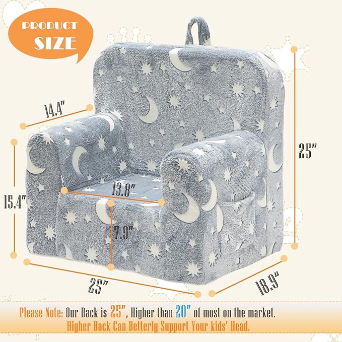 - 💫【GLOW IN THE DARK MOON TODDLER ARMCHAIR】➤ Expose SUFUS Glow in The Dark Toddler Chair Couch to a bright light or daylight, then turn off the lights at night and watch the magic happen! The glow light can create a dreamy atmosphere in your bedroom, as if you were floating in the universe and surrounded by the stars and moons, How incredible and amazing!