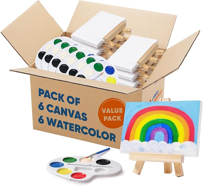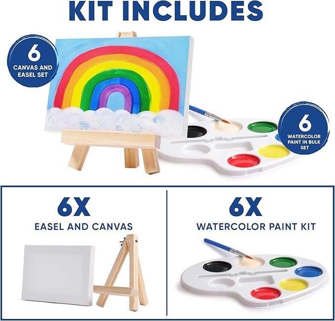 - Superb Value - Comes with bulk set of 6 kids mini canvas (4x6”) with mini easel and 6 water color paint Sets. The paint palette tray contains 6 colors and a painting brush. Perfect rainbow party favours for kids 3-5! Or any other fun themes!