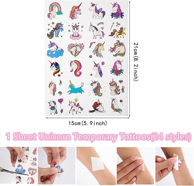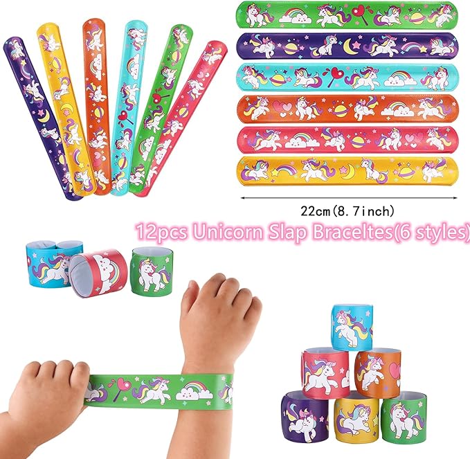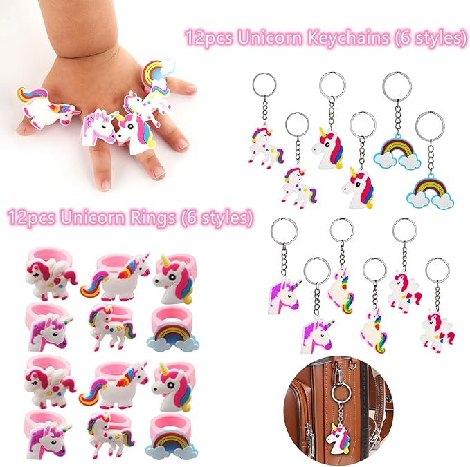 - GREAT VALUE PARTY FAVORS---the package include 84Pcs party favors. Include 12* Unicorn slap bracelets, 12*Unicorn rings, 12* Unicorn keychains, 12*Unicorn themed stamper, 12*Unicorn stamps,24 Styles tattoos for kids, enough for your party.