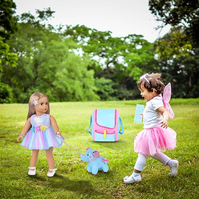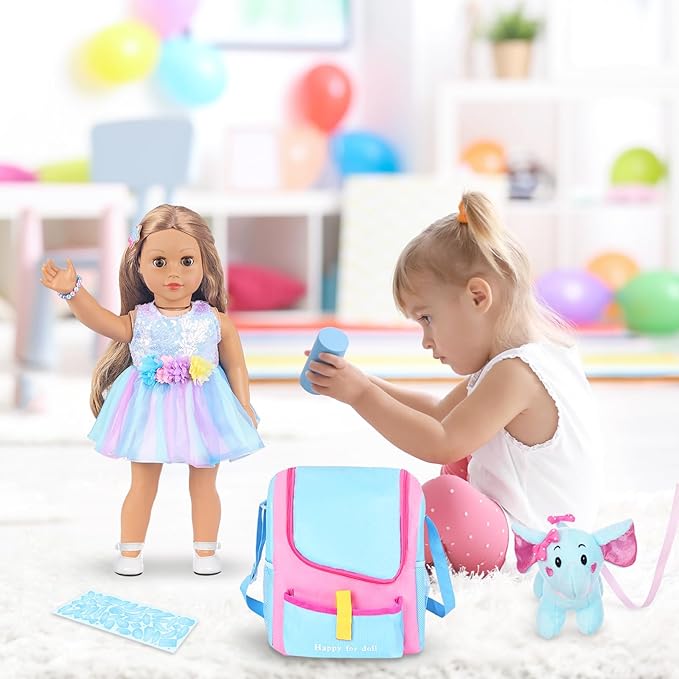 UNICORN ELEMENT 18 Inch Girl Doll Accessories with Doll Carrier Bag + Dress + 2 Hairpins + Blue Sticker + Bracelets + Toy Elephant, Baby Doll Clothes and Accessories for 18 Inch Doll (No Doll)