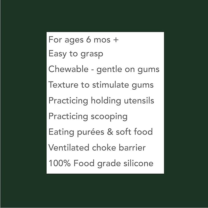 - DESIGN: ergonomically designed short flatter handle (unlike other silicone utensils on market) for better grip, the self feeding. It has ventilated choke barrier.