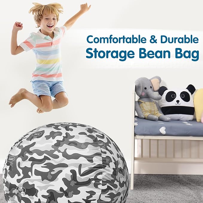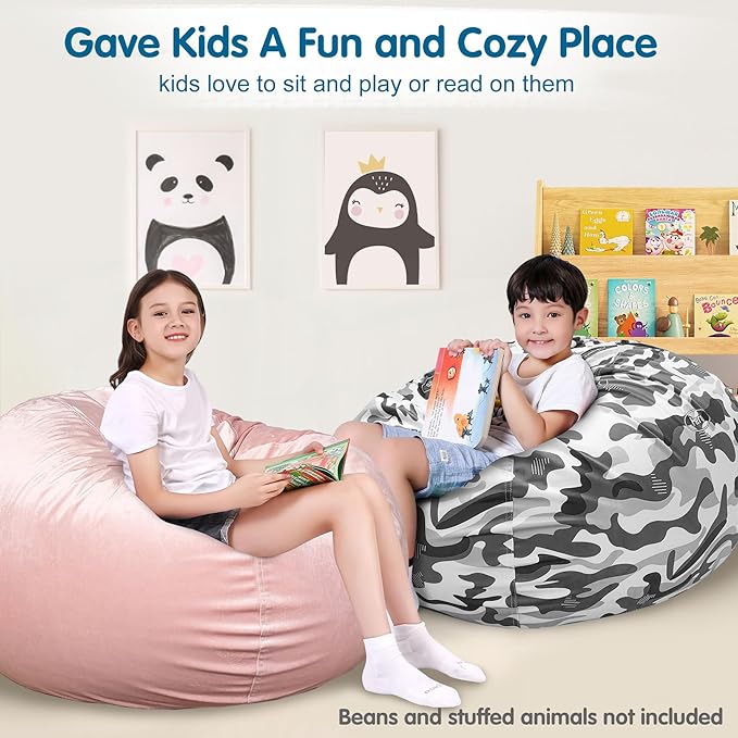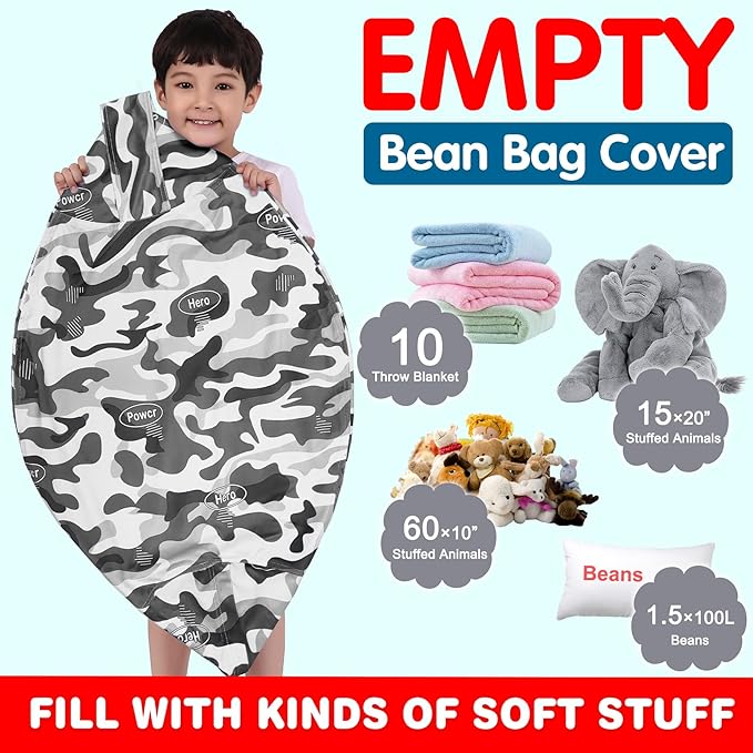 Lukeight Stuffed Animal Storage Bean Bag Chair Cover for Kids, Zipper Beanbag Chair Cover for Organizing Toddler and Kids' Rooms Plush Toys (Camo Velvet, Large)