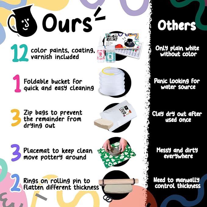• ⚱️ALL-IN-ONE POTTERY SET | The air dry clay pottery kit for adults is designed with every tool, paint, varnish and more that you would need for your at-home pottery experience. From the 3.3lb of clay that's enough to make 4-6 potteries, distinct tools to 12 different color paints, it is a perfect clay making kit for beginners.