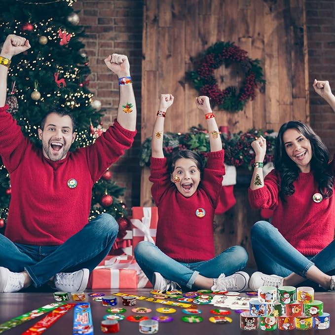 - Christmas Supplies: the package includes 48 pieces Christmas slap bracelets,48 pieces Christmas badges and 48 pieces tattoo stickers,144 pieces Christmas party favors in total; sufficient quantity and styles are enough to meet your different needs, colorful elements patterns which will be liked by your family and friends
