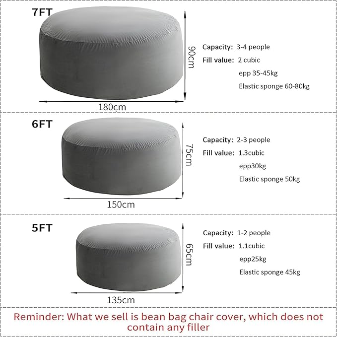 - PERFECTLY SIZED : 5ft=130*60CM(Capacity:1-2 people ); 6ft=150*75cm (Capacity: 2-3 people ); 7ft=180*90cm (Capacity: 3-4 people) ; (Measurements are taken from an unfilled bean bag.) Package Included: 1 x Sofa Bean Bag Cover (NO Filler) Perfect for sprawling out on your own in living rooms, dorm rooms, rec rooms and bedrooms.(ONLY COVER, NO FILLER )