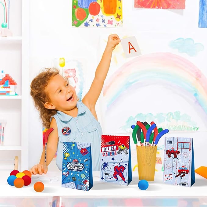 - Classic Hockey Design: Designed with hockey-related patterns and texts, hockey goodie bag, hockey button badges, hockey slap bracelets, and hockey pencils echo the hockey theme party to enhance the atmosphere; Our hockey birthday party supplies can be matched with your hockey-style outfit, wear them to a hockey themed party to make you glamorous and the focus of the crowd.