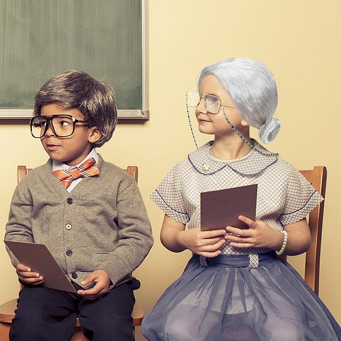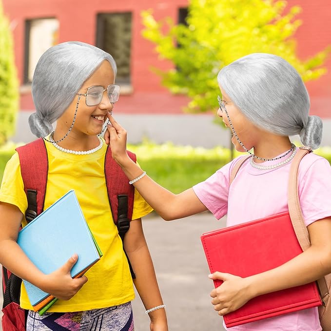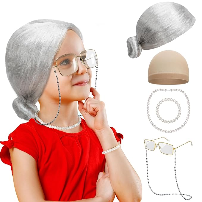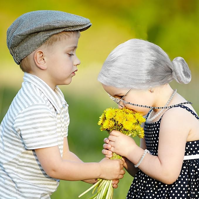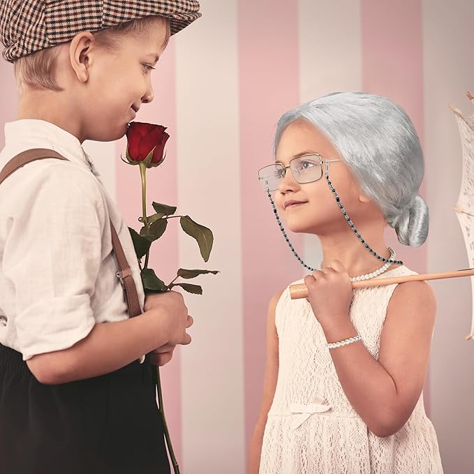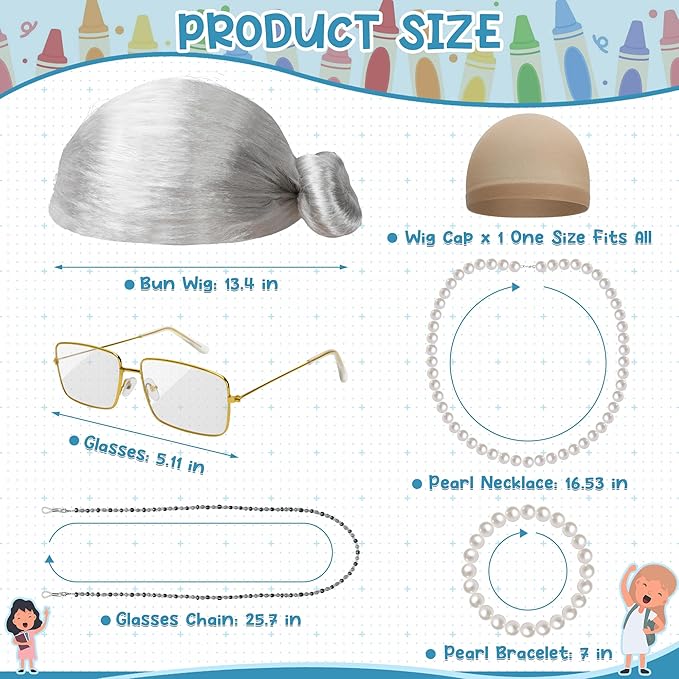 - Suitable Size - The bun wig measures 13.4 in, with a stretchy wig cap, making it suitable for all kids. Along with a 16.53-inch artificial pearl necklace, a 7-inch pearl bracelet, 5.11-inch old lady glasses, and a 25.7-inch glasses chain.