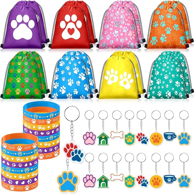 - Meet Your Requirements: you will receive 16 pieces of paw print drawstring bags, 16 pieces of party keychains in different colors and 16 pieces of wristbands in multiple designs, 48 pieces in total, a complete combination and sufficient quantity can easily meet your daily using needs