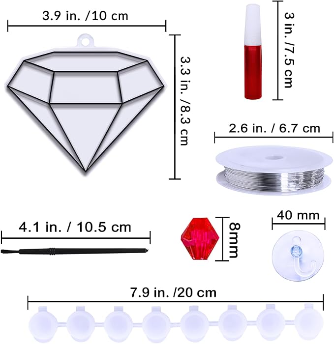 • Size: The Jewel Suncatchers are approximately 4" in diameter. Each bottle of suncatcher paint has a capacity of 0.2 fl oz/6ml, and each mini empty paint pot holds 0.06 fl oz/2ml of paint. The acrylic beads are about 0.3" in diameter, the fishing thread is 393" long, and each suction hook is about 2.3" in diameter. These jewel window art decorations are perfect for hanging in windows, glass doors, gardens, and porches.
