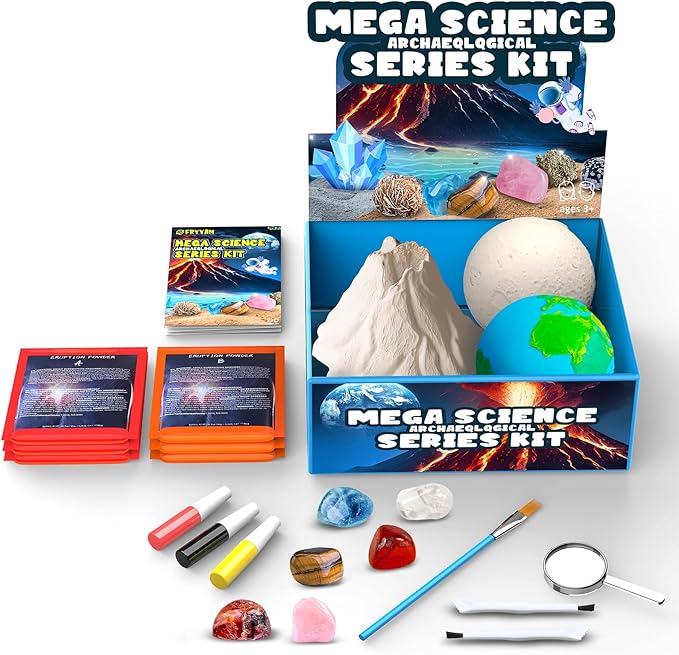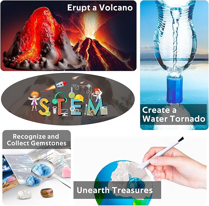 - 【EXTENSIVE SCIENCE EXPLORATION】Unleash your child's curiosity with this fun & educational science kit. The kid toy offers many experiment activities, including creating erupting volcanoes, grow a crystal, geologic digs, and more. Spark your kid's curiosity & imagination & boosts kids' cognitive skills.