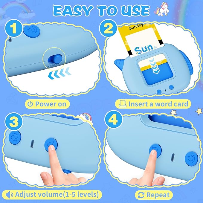 - 【Fun & Easy Learn while Playing】No WIFI needed, No screen design, pre-recorded standard pronunciation English words with intuitive and interesting flashcard, easy operation for kids to learn indepently. Just insert the double-sided card to the card reader and learn. And there is 1-5 volume levels to choosen from. Improve children’s learning ability in a fun way, also promote the interaction with parents and enhance family happiness.
