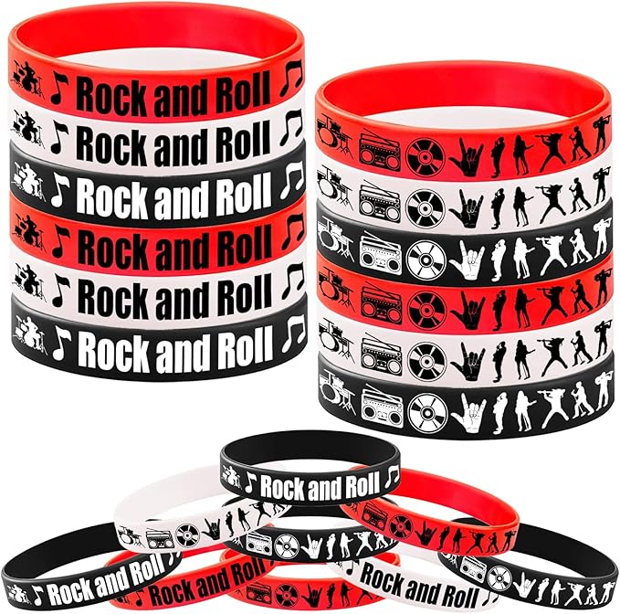 - Rock and roll Silicone Bracelets Set:24 pieces of rock and roll themed rubber bracelets with 3 different colors, black,red and white.
