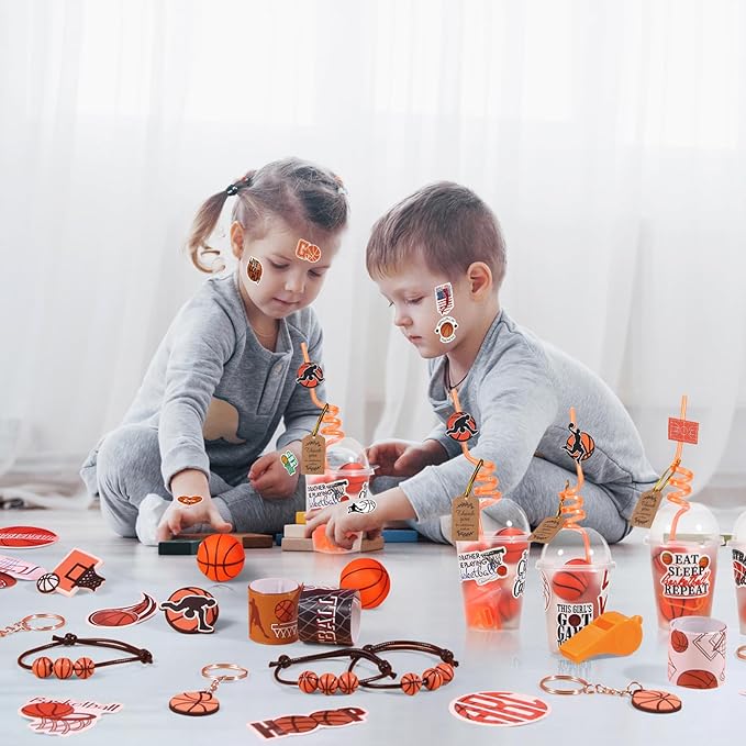 - Large Quantity Basketball Party Favors: you will receive 12 pcs cups with dome lids, 12 pcs basketball straws, 12 pcs basketball whistles, 12 pcs basketball key chains, 12 pcs mini basketball, 12 pcs basketball bracelets,12 pcs slap bracelets, 12 pcs thank you tags, 12 pcs twist ties,50 pcs basketball themed stickers, sufficient quantity to meet your daily or party needs.
