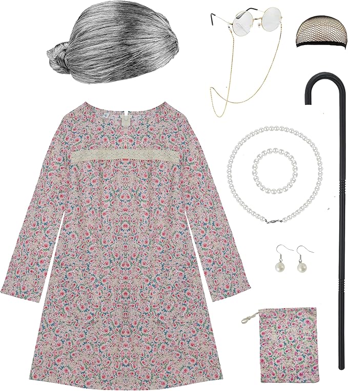 • 1:Package includes: 1 Wig with Curles and Wig Cap,1 Cotton Dress,1 Glasses with Chains Strap, 1 Cane,1 Tiny Wrist bag,1 Necklace.