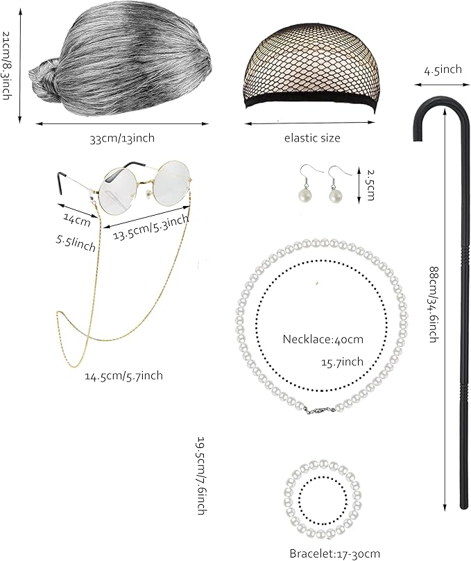 - 1:Package includes 6 pcs: 1 Wig with Curles and Wig Cap,1 Cotton Dress,1 Glasses with Chains Strap, 1 Cane,1 Necklace.