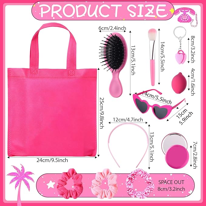 108 Pcs Hot Pink Princess Gift Bags Set Hot Pink Princess Party Favors Kit, 12 Pink Keychains 12 Makeup Mirror 12 Sponge 12 Gifts Bags 12 Heart Sunglasses 12 Brush Headband Hair Band Combs