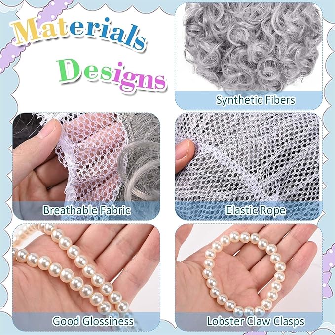 • 【Reliable and Safe】our old lady wig is made of high-quality synthetic fiber, strong and durable;our glasses are made of plastic frames and clear fake lenses which will not change your vision or hurt your eyes.the necklace and bracelet are made of artificial pearls and a durable metal clasp,comfortable to wear.Black cane is made of quality material,sturdy and not easy to fade or break.Handbag is made of quality brocade,convenient and practical,service you for a long time.