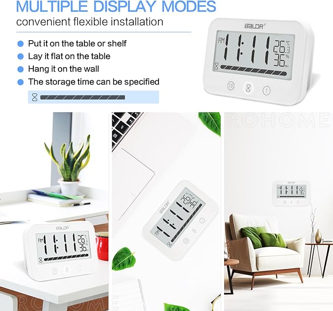 - It is a ideal clock and timer with humidity meter and temperature monitor for bathroom ( IP24 water resistant for water spray, Do not put in water ). Easy to hang it on the wall by 2 hooks (included). Easy to switch temperature between Celsius and Fahrenheit and time between 12H and 24H. The visual time progress bars allows kids/elders to catch time in a joyful way better. Great visual timer & clock & thermometer hygrometer combo for family members.