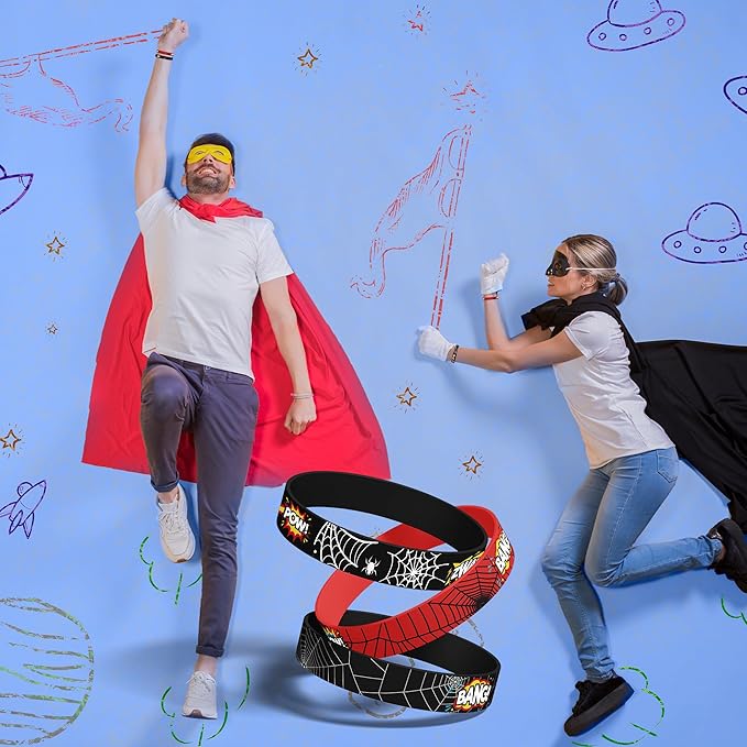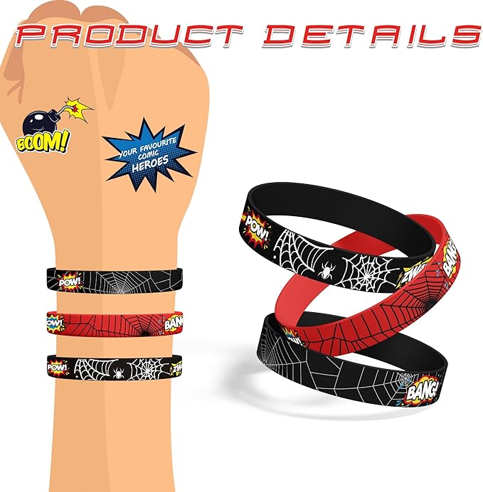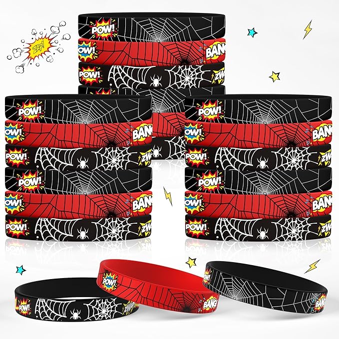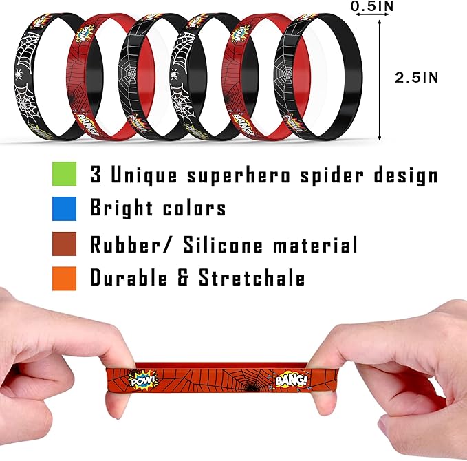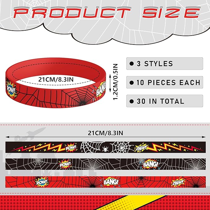 - The superhero spider silicone bracelets come in 3 patterns, with 10 bracelets of each design, 30 in total. Standard size, suitable for most teenagers and adults, colorful and funny to wear on hands, make you eye-catching among people.