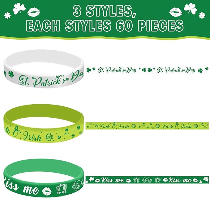 - Shamrock Theme: you will receive 180 pieces st Patrick's Day shamrock bracelets in 3 colors and styles with different fonts [St Patrick's Day], [Luck O Irish] and [Kiss Me]; And printed with various popular elements of St. Patrick's Day, symbolizing good luck and wish, funny and adorable
