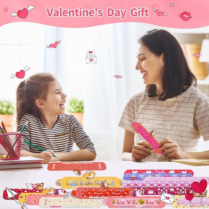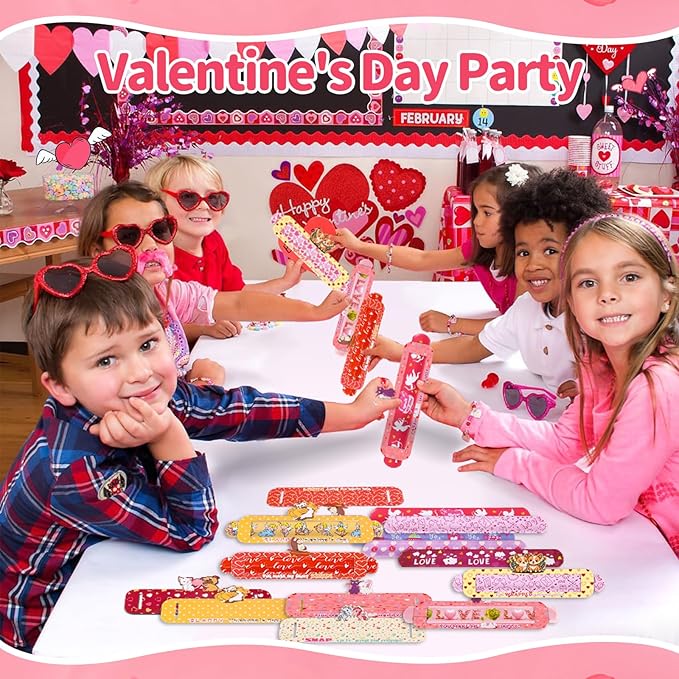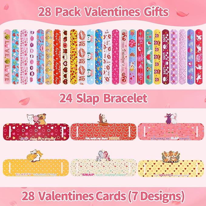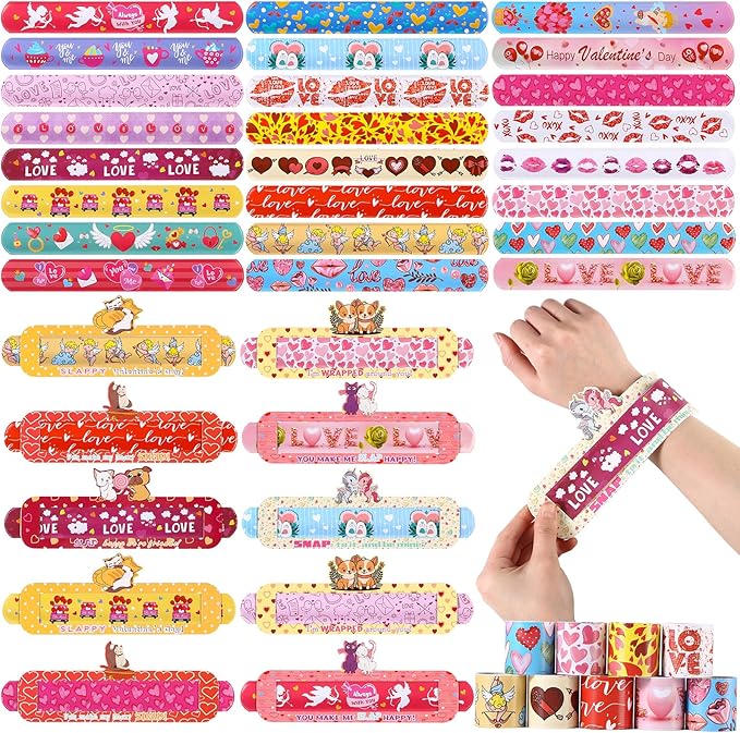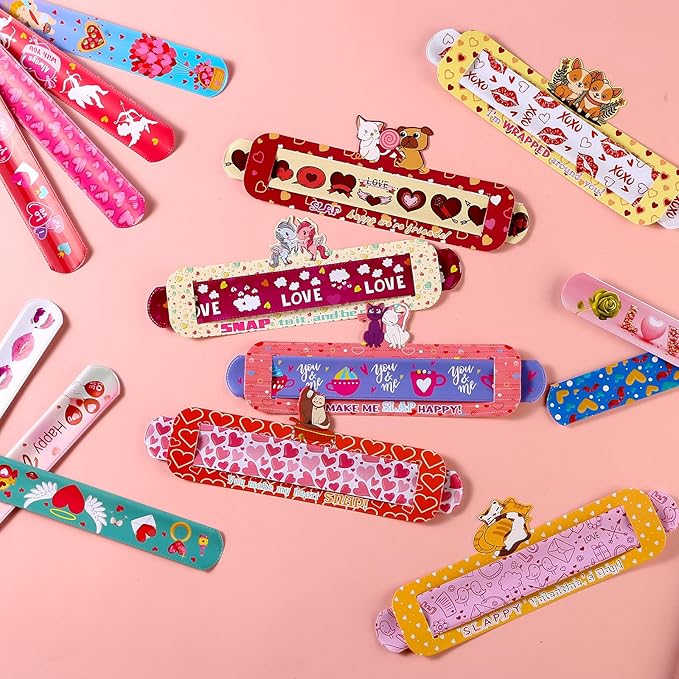 - Super Value Valentines Slap Bracelets Set: This valentine box contains 24pcs bulk bracelets with various valentine patterns, 24pcs valentine’s card to decorate cute valentines toys. Cards has 6 patterns,each pattern has 4 pieces,you can make unique valentine gifts with your children for their friends or classmates.Nice class valentines gifts bulk,valentines cards for kids classroom.