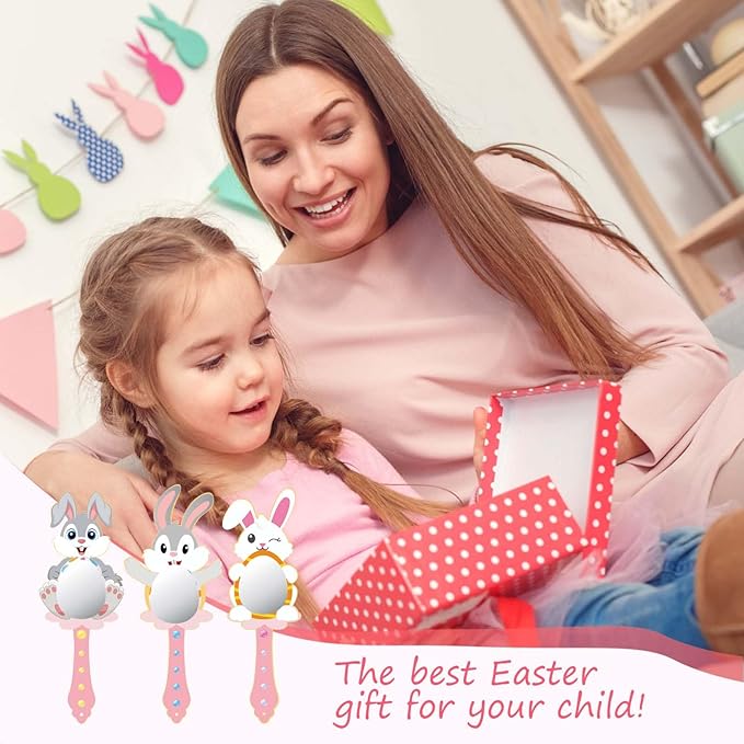 - Easter Craft Kit for Kids: This wooden DIY mirror includes 9x unfinished wooden bunny head cutout ,9x egg-shaped mirror,2x paiting brushes 2x paints(12 colors),1x rhinestone sticker, has enough accessories to make wooden mirrors together. Through party activities, you can share this bunny mirror with friends and spend Easter party.