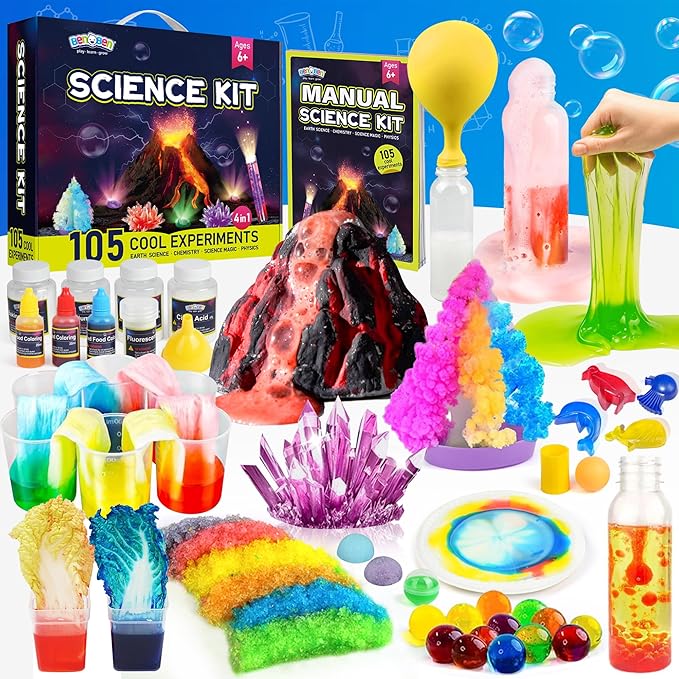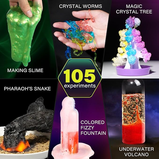 • 105 Cool Experiments for Kids: Our science kit for kids ages 8-12 covers earth science, chemistry, physics, science magic tricks and more topics, includes all different types of over 100 science experiments; Science toys have all the classic, popular and fun experiments like volcano erupting, crystal growing, geodes, water slime, soap making, pharaoh's snake, magic sand and many more stem projects; Keep your kids busy and learn science in a fun way!