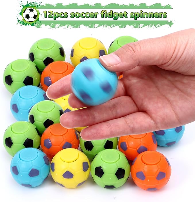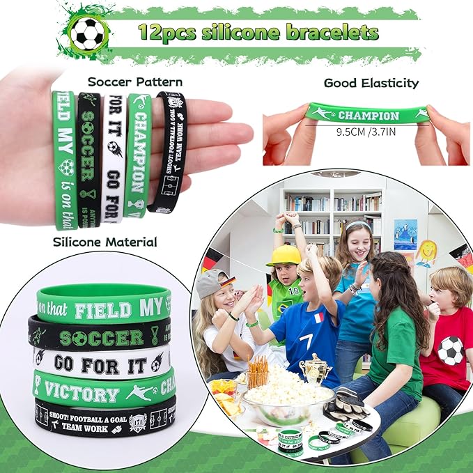 - Meticulous Soccer Design - Each item in our soccer party supplies features creatively integrated soccer elements that kids adore. The two different patterns on the soccer party favor bags attract everyone's attention. Customized soccer bands for boys are printed with inspirational words such as "VICTORY", "CHAMPION" and "SOCCER" to ignite their competitive spirit. The vibrantly colored football fidget spinner spins easily on your fingertips, relieving stress and adding fun