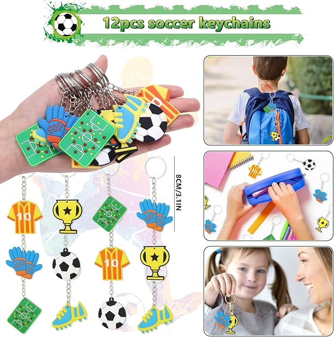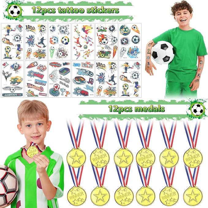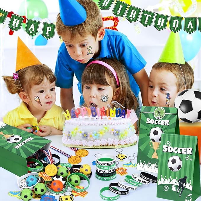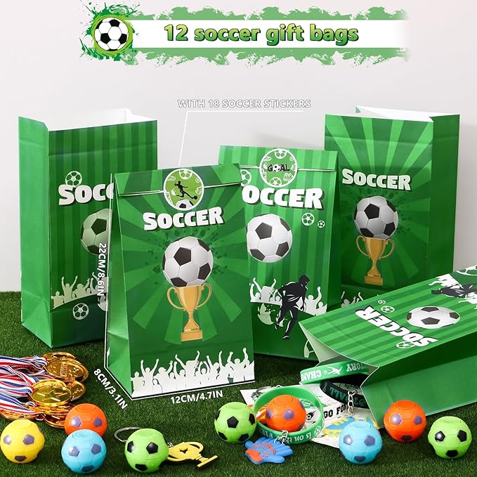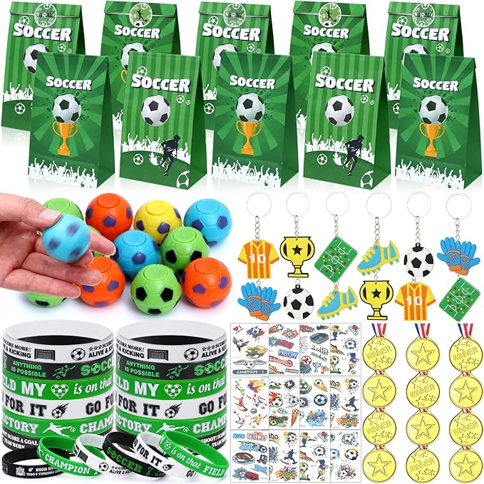 - Abundant Soccer Party Favors - Our soccer birthday party favors includes 12 soccer gift bags, each filled with 18 mini round stickers, 12 soccer fidget spinners, 12 soccer medals, 12 soccer silicone bands, 12 soccer keychains and 12 tattoo stickers. In total, there are 72 soccer goodie bag favors that make every young soccer enthusiast attending a soccer birthday party will go home feeling truly rewarded