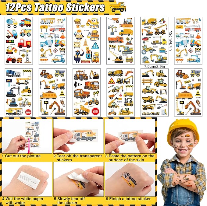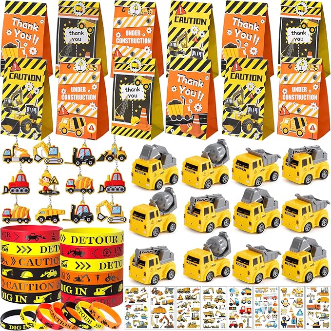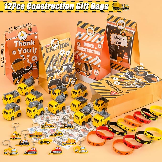 - Comprehensive Construction Party Favors - The carefully selected construction party favors set contains 12 construction gift bags with 18 round stickers, 12 construction vehicle toys, 12 silicone bracelets, 12 keychains, 12 construction tattoo stickers. With a total of 60 unique items, it's a great construction gift for a construction birthday party for every boy or girl who loves engineering. Leave wonderful memories for your children with these construction birthday party favors