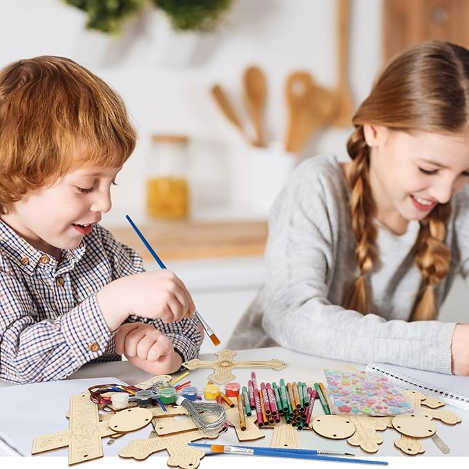 - Cross Craft Kit for Kids:the DIY wooden cross wind chimes kit for kids include 9x unfinished wooden cross cutout set,27x wind chime tubes(3 colors, 9 for each color),2x painting brushes,1xpaint(6 colors),9x 1M silver wire,9 x color rope,1x rhinestone stickers.Sufficient quantity and various styles to meet your decorative needs,kids can make their own wind chime kit to celebrating Easter.