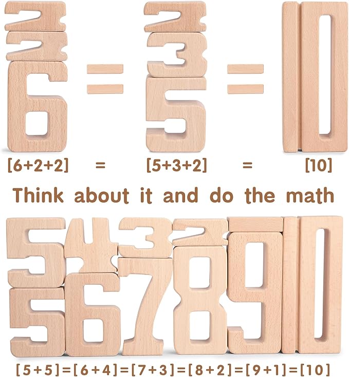 - [SAFETY & ENVIRONMENTAL PROTECTION] : Made of high-quality beech wood. Unlike other wooden numbers building blocks, our counting blocks are unpainted, large, easy to grab, and suitable for children's little hands. The surface of the wooden blocks is smooth and flat without sharp edges and corners, making it durable and not easily deformed
