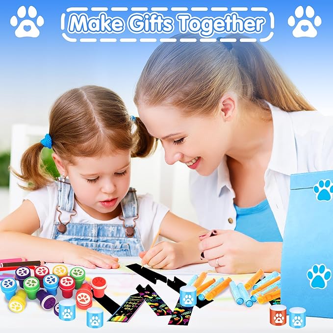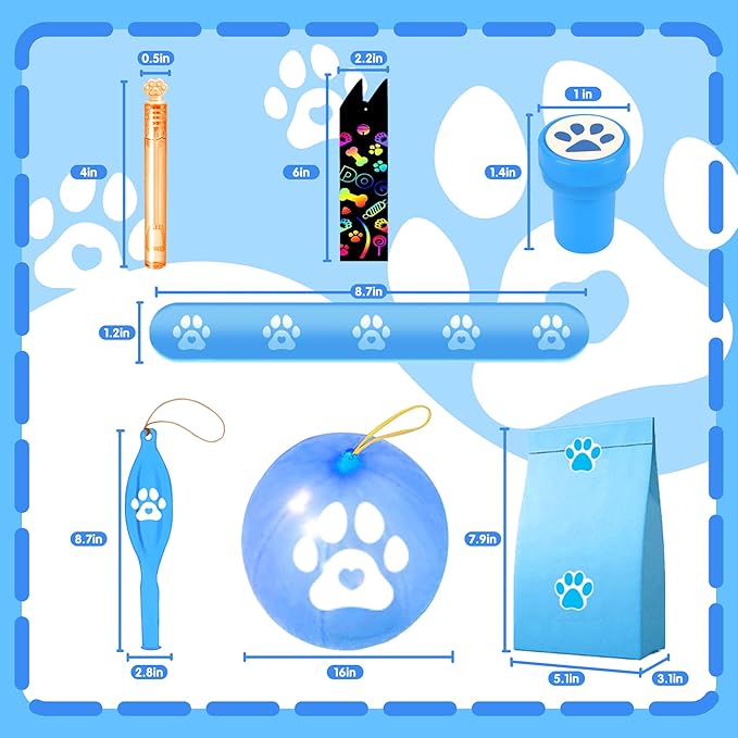 - 12 PACK PARTY FAVORS TOYS SET : Unleash the excitement with an impressive assortment of party favors, ensuring every child's delight. This Dog Paw themed party favor set features 12 set scratch art bookmarks, 12 bubble wands, 12 slap bracelets, 12 punch balloons, 12 paper gift bags ,a roll of stickers and in a variety of vibrant colors.