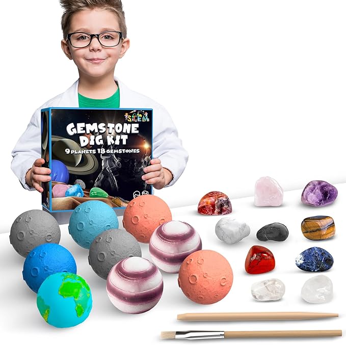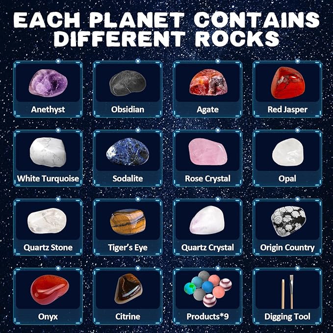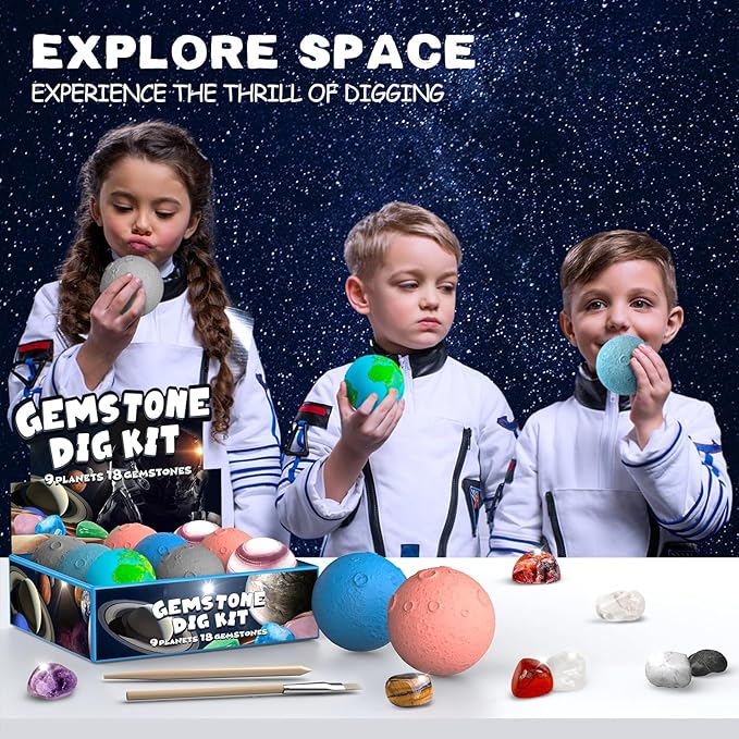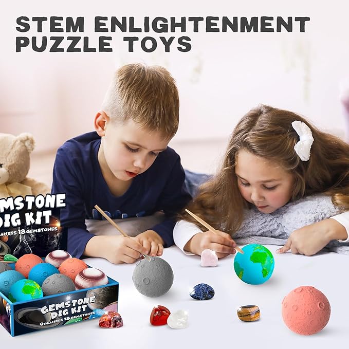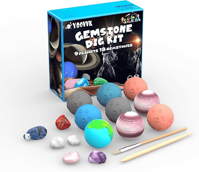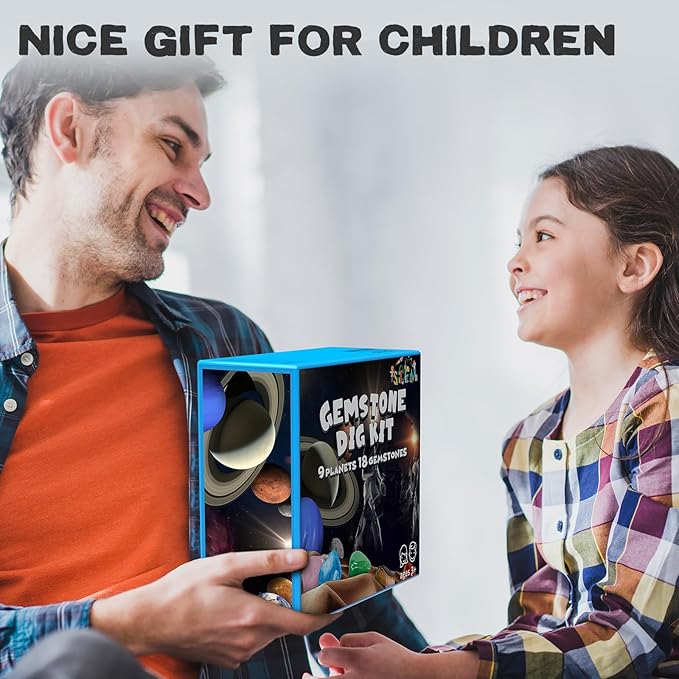 - 【Voyage into Planetary Realms】Gem Exploration Kit offers a portal into the marvels of the solar system. As children dig and discover representations of 9 planets, a typical science lesson metamorphoses into an engaging, entertaining exploration of our celestial neighbors. The kit bridges the gap between theoretical knowledge and hands-on experience, fostering a deeper understanding of planetary science.