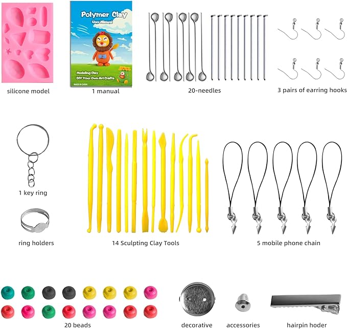 - Included Components : Instruction Guide, Sculpting Tool 14pc, Silicone Mold, Accessory Kit, Double-layer organizer, Polmer clay 51 colors, 51pc Instruction Guide, Sculpting Tool 14pc, Silicone Mold, Accessory Kit, Double-layer organizer, Polmer clay 51 colors, 51pc