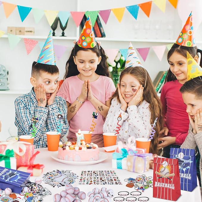 - FUN BASEBALL GIFT BULK- This baseball candy bag contains a variety of fun items. Kids can simulate games or play with mini baseball toys for added interactivity and entertainment. Kids can dress up with bracelets and tattoos for added engagement and interaction at the party. Baseball themed straws also add some fun to party drinks.
