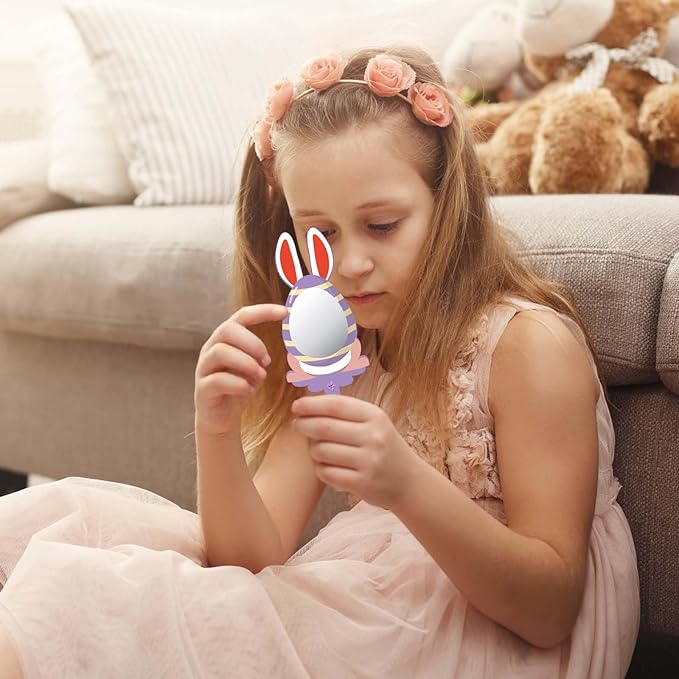 - Easter Craft Kit for Kids: This wooden DIY mirror includes 9x unfinished wooden bunny egg cutout ,9x egg-shaped mirror,2x paiting brushes ,1x paints(6 colors),1x rhinestone sticker, has enough accessories to make wooden mirrors together. Through party activities, you can share this bunny mirror with friends and spend Easter party.