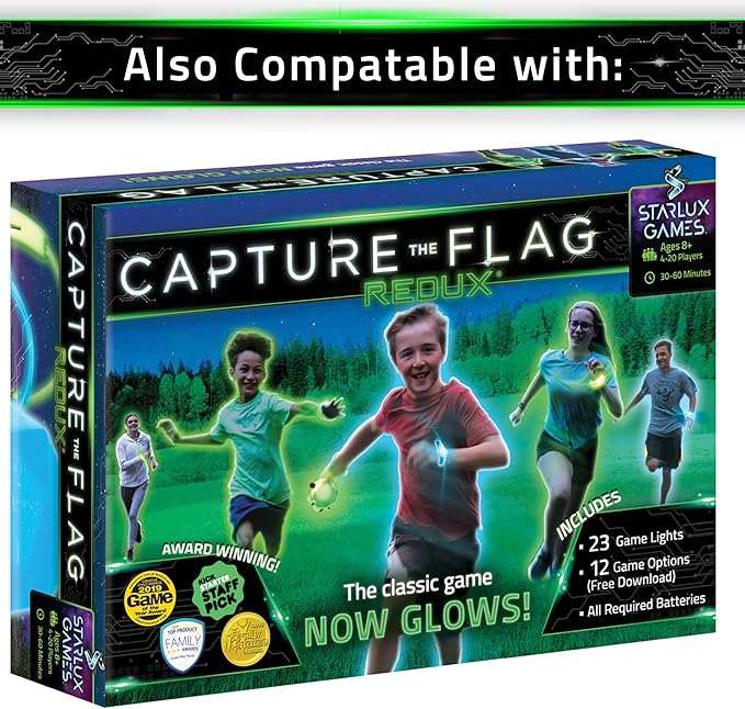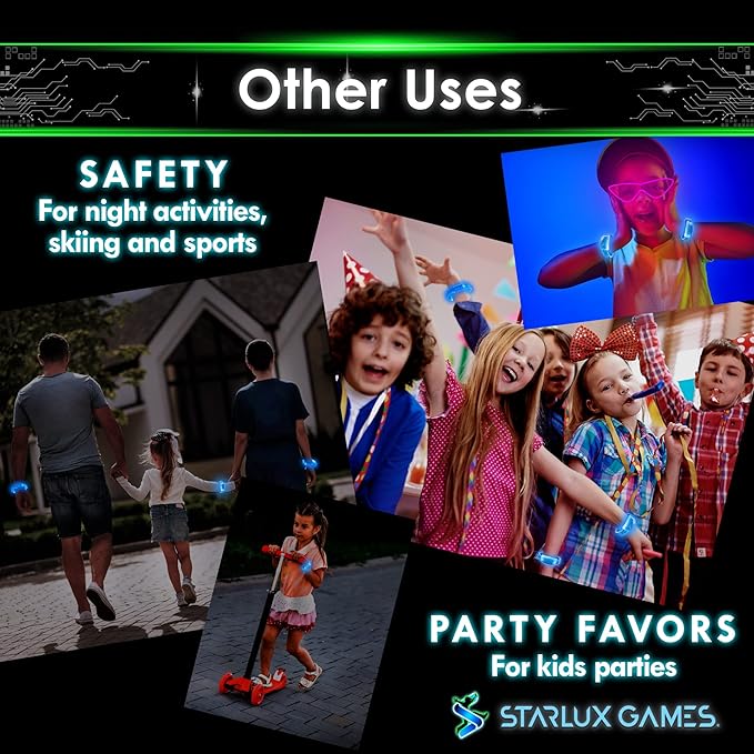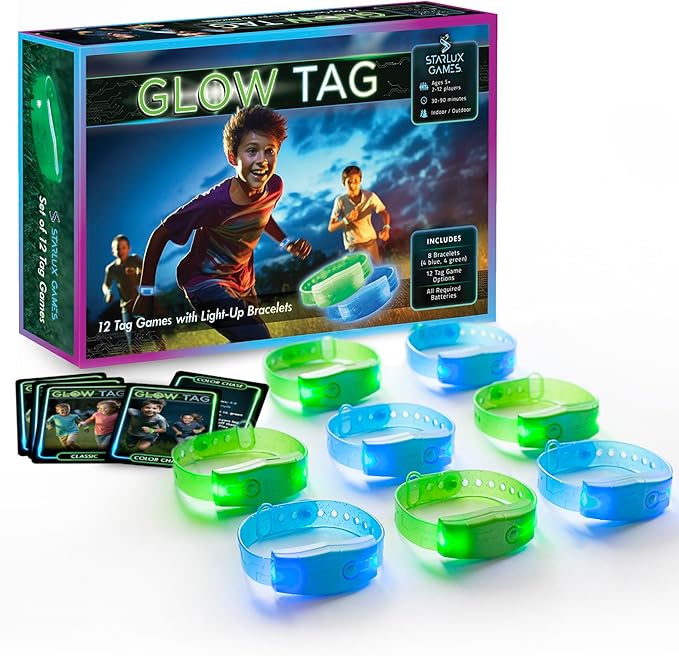 Starlux Games Glow Tag - an Outdoor Night Game for Kids | Ages 5+ | Includes 12 Light Up Bracelets & 12 Tag Games (Flashlight Tag, Freeze Tag & More) | Glow Games | Glow in The Dark Outdoor Toys