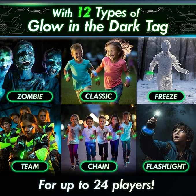 - ULTIMATE TAG EXPERIENCE: Light up you outdoor & indoor night games with these 12 LED bracelets and experience tag as never before with 12 different glow in the dark tag game options.