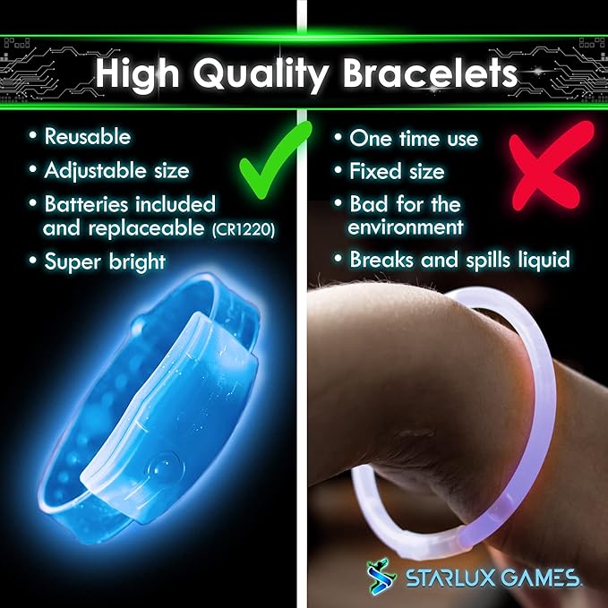 - BRIGHT & ADJUSTABLE: These are more than glow in the dark bracelets! They’re lit by 2 powerful LEDs, offer resizable wristbands, turn on/off and last 12+ hours (batteries included and replaceable, type CR1220)
