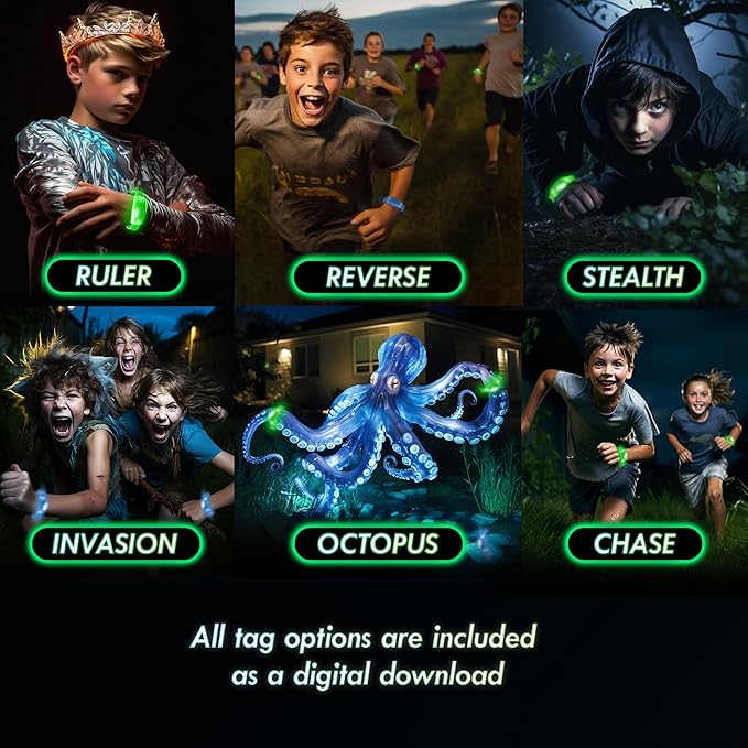 - MANY GAME OPTIONS: Add these bracelets to glow in the dark basketball, football or volleyball; or try the included games like Classic, Flashlight Tag, Zombie tag, Freeze, Tag Ruler, Octo-Glow and more