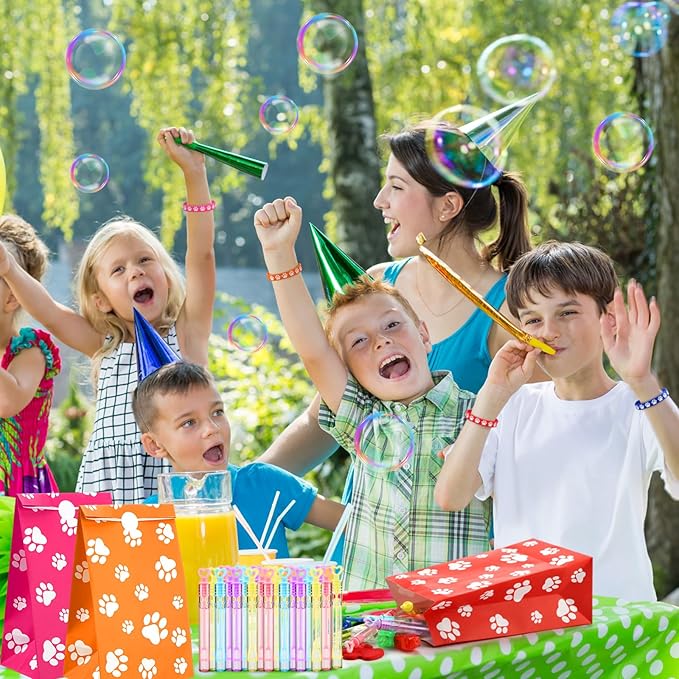 - Ideal Size: the paw print party favor bags are about 8.3 x 4.7 x 3.1 inches, providing adequate space for storing party essentials; The stickers, with a diameter of around 1.57 inches, are rightly sized for easy application; The silicone bracelet measures approximately 0.5 x 8 inches, ideal to fit most wrists, and the paw print bubble wands come with a compact size of approximately 4.1 x 0.5 inches for easy handling