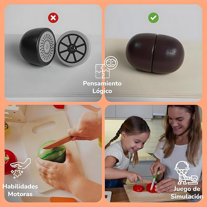 - [LEARN & PLAY COMBO]: Mini Minds' Wood Play Food and Magnetic Food Cutting Toys for Kids turn learning into fun. The Montessori kitchen setup boosts focus and sparks math skills through engaging play. Perfect wooden cutting food toys for toddlers that encourage imaginative play, and ideal play food for kids ages 4-8 looking to explore their culinary creativity.