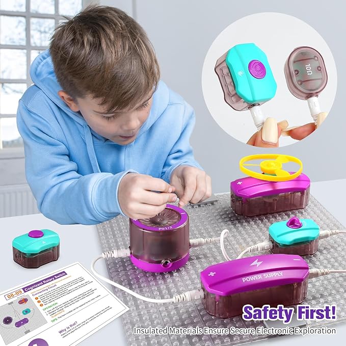 - IS IT SAFE AND EASY TO USE?——Designed with safety in mind, featuring rounded corners, insulated packaging, and user-friendly interfaces, ensuring a confident exploration of circuit toys. The detailed instructions and 40 circuits for kids 8-12 construction schemes make it easy to use, even without specialized knowledge.