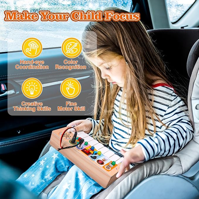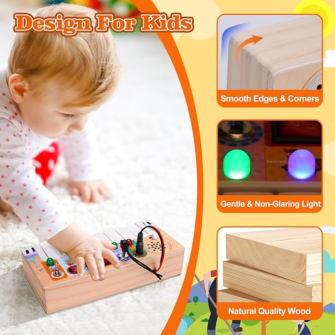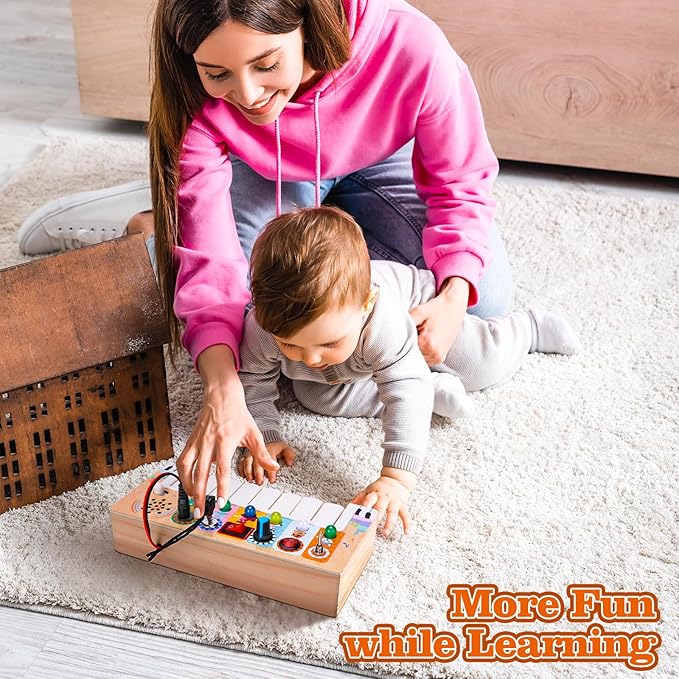- Fun and Educational Toys: This baby wooden piano busy board is a Montessori toy that offers endless fun and learning opportunities for toddlers. 8 Piano Keys with 6 Light Switch of Animals Call, this sensory board will captivate and fascinate your child. It is the perfect toy for developing fine motor skills, hand-eye coordination, and color recognition.