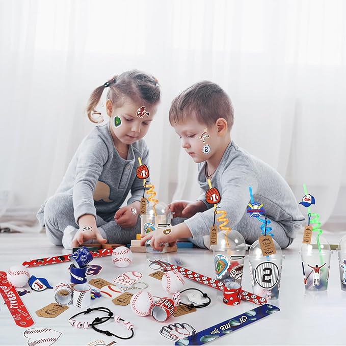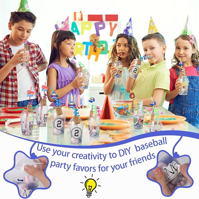 - Quality and Reliable Material: Baseball bracelets are made of quality materials, baseball straws and whistles are made of ABS plastic, mini baseball are made of pu materials, baseball themed stickers are made of PVC; the cup is made of quality PP material, and the thank you tag is made of Kraft Paper, which is reliable and safe to use, not easy to fade or break, reusable and sturdy.