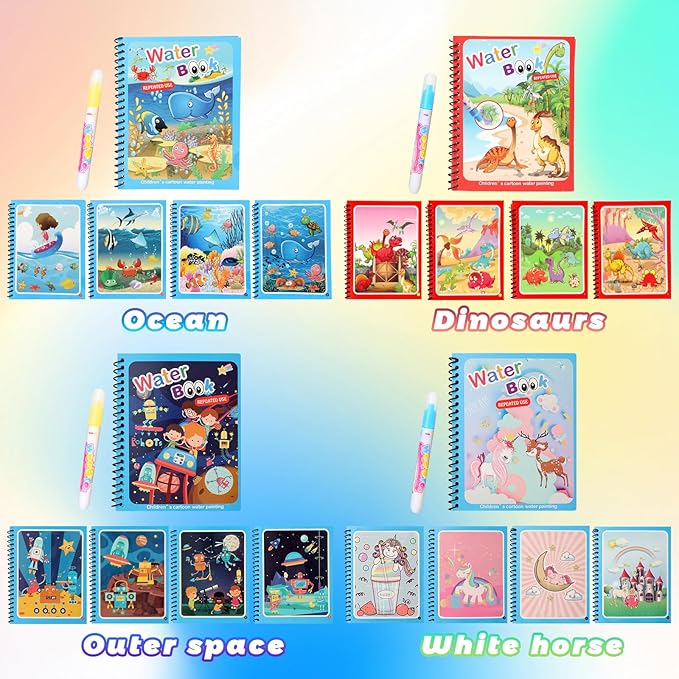- 【Reusable Pages】The pages of the water-drawn book can be used over and over again. Just wait a few minutes for the pages to dry and the colors to fade, allowing young children to start over. This makes it a sustainable paint with water books.