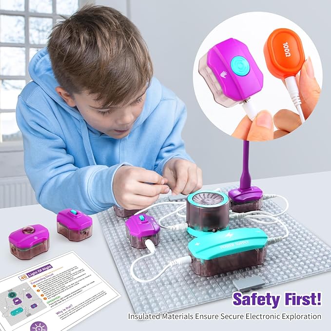 - IS IT SAFE AND EASY TO USE?——Designed with safety in mind, featuring rounded corners, insulated packaging, and user-friendly interfaces, ensuring a confident exploration of circuit toys. The detailed instructions and 40 circuits for kids 8-12 construction schemes make it easy to use, even without specialized knowledge.