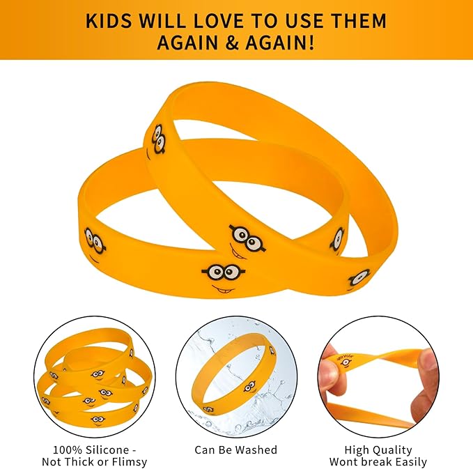 - 25 pack of bright yellow wristbands with multiple funny faces with eyes . Makes a great addition to the popular movie themed party!